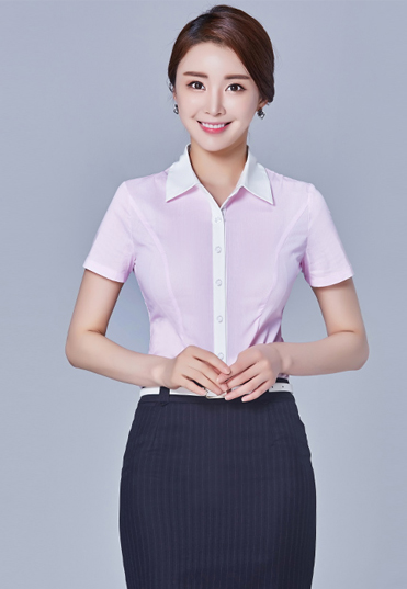 | 优雅粉色短袖女衬衫,经典翻领,时尚简洁,不失干练气质。领子及门襟拼白色调节,扣子结实耐 |