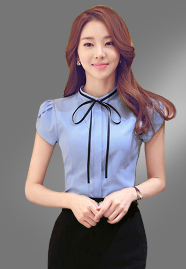 | 女士短袖衬衫定制,蓝色修身设计,领口带有蝴蝶系带,泡泡袖设计,显示这件衬衫的独特特点。 |