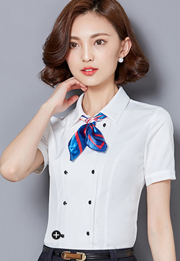 | 女士短袖衬衫,修身款式,双排扣设计,增强衬衫质感,外八字领设计,搭配彩色丝巾,提升整体 |