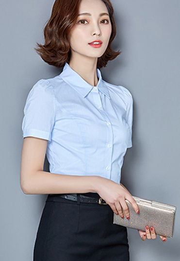 | 女式短袖衬衫定制,蓝色泡泡袖设计,显示女士的乖巧可爱,外八字领领口设计,显示女士稳重成 |