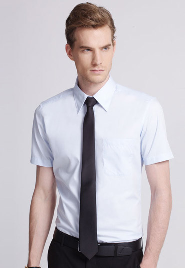 | 浅蓝色商务短袖衬衫,干净整洁。采用3D立体裁剪技术,新研发的定型技术,领部定型多次洗涤不 |