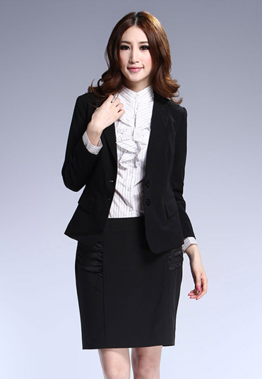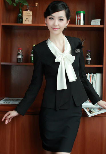 | 女士职业装,下摆设计精湛,黑色搭配白色八字领衬衫,领导风范尽显无疑,包臀裙设计,展现女 |